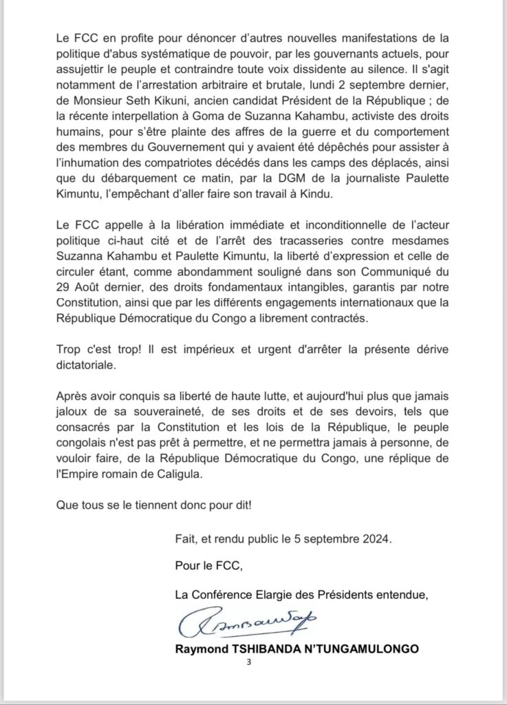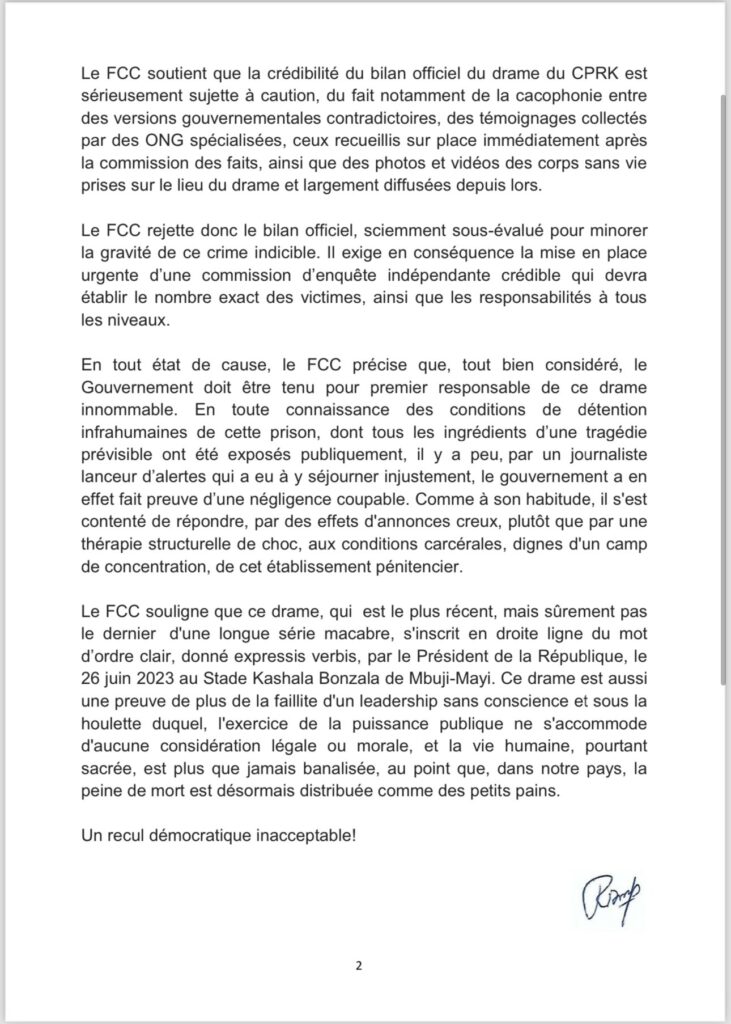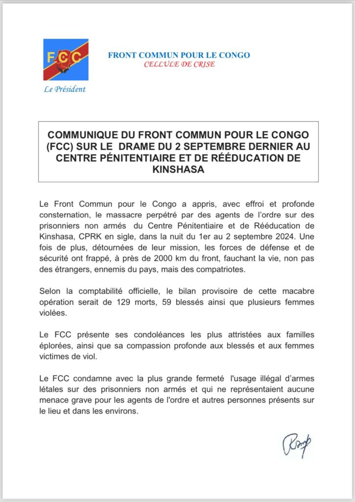 Dans un Communiqué officiel signé par son Secrétaire Général, Raymond Tshibanda, le Front Commun pour le Congo, condamne avec derrière énergie le massacre des prisonniers à MAKALA dont la comptabilité officielle, fait le bilan provisoire de cette macabre opération serait de 129 morts, 59 blessés ainsi que plusieurs femmes violées.